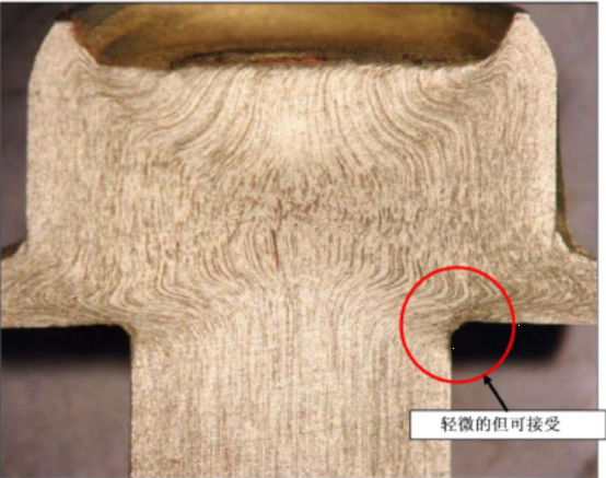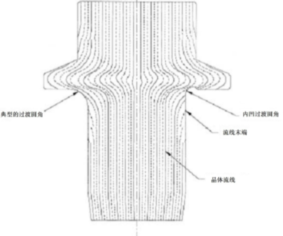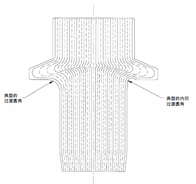 注:壓縮區(qū)是鍛造過程中產(chǎn)生的材料晶體流。這些是基本金屬的壓實(shí)流動(dòng)晶體,并在鍛造過程中流動(dòng)形成零件形狀。整個(gè)壓實(shí)金屬流線應(yīng)位于支承面或支承面上方,因?yàn)樵搮^(qū)域包含可能導(dǎo)致制造和零件性能不良的最大內(nèi)應(yīng)力。
