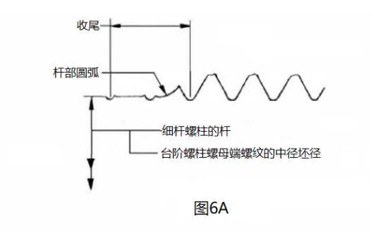3.3.5螺紋收尾,中徑桿緊固件:與螺紋毛坯直徑相當(dāng)?shù)?/span>中徑桿部件,其螺紋滾制應(yīng)具有0.6個(gè)螺紋螺距和最大2個(gè)螺距的最小螺紋收尾。見圖7C