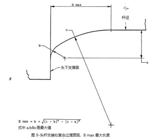收尾應(yīng)符合3.3.4中關(guān)于粗桿條件的規(guī)定,以及3.3.5中關(guān)于中徑桿條件的規(guī)定,但不得侵占頭部至柄圓角半徑“B”,或圖9中所示的復(fù)合圓角長度B max。