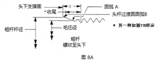 3.3.7帶肩螺栓的螺紋收尾:帶肩螺栓的桿徑和跳動(dòng)X端部與螺紋小直徑之間的過渡段應(yīng)具有如圖8D所示的3.3.4.1中所述的半徑A,位于軸肩與內(nèi)凹和不完整螺紋的接合處。